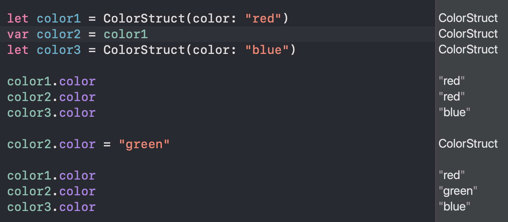 복사한 인스턴스인 color2의 값을 변경해도, color1의 값에 영향을 주지 않습니다. 또한, 값을 변경하기 위해서는 var 키워드를 입력해야합니다.