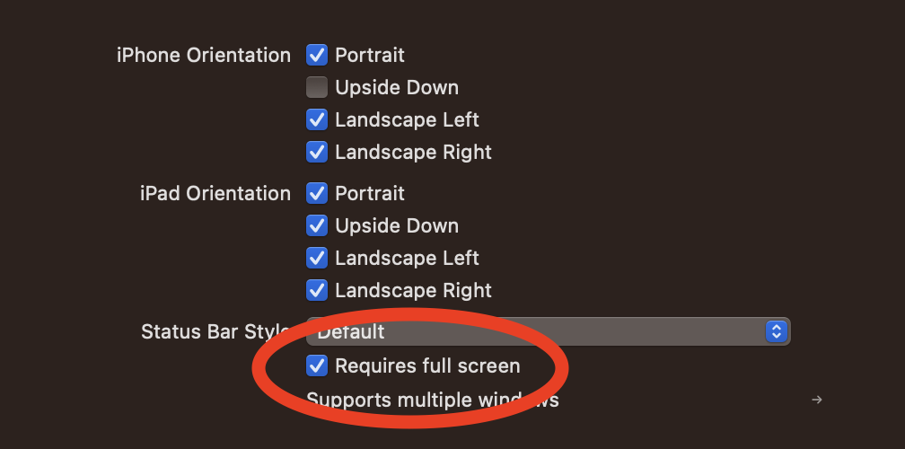 - Target -> General -> Requires full screen 체크