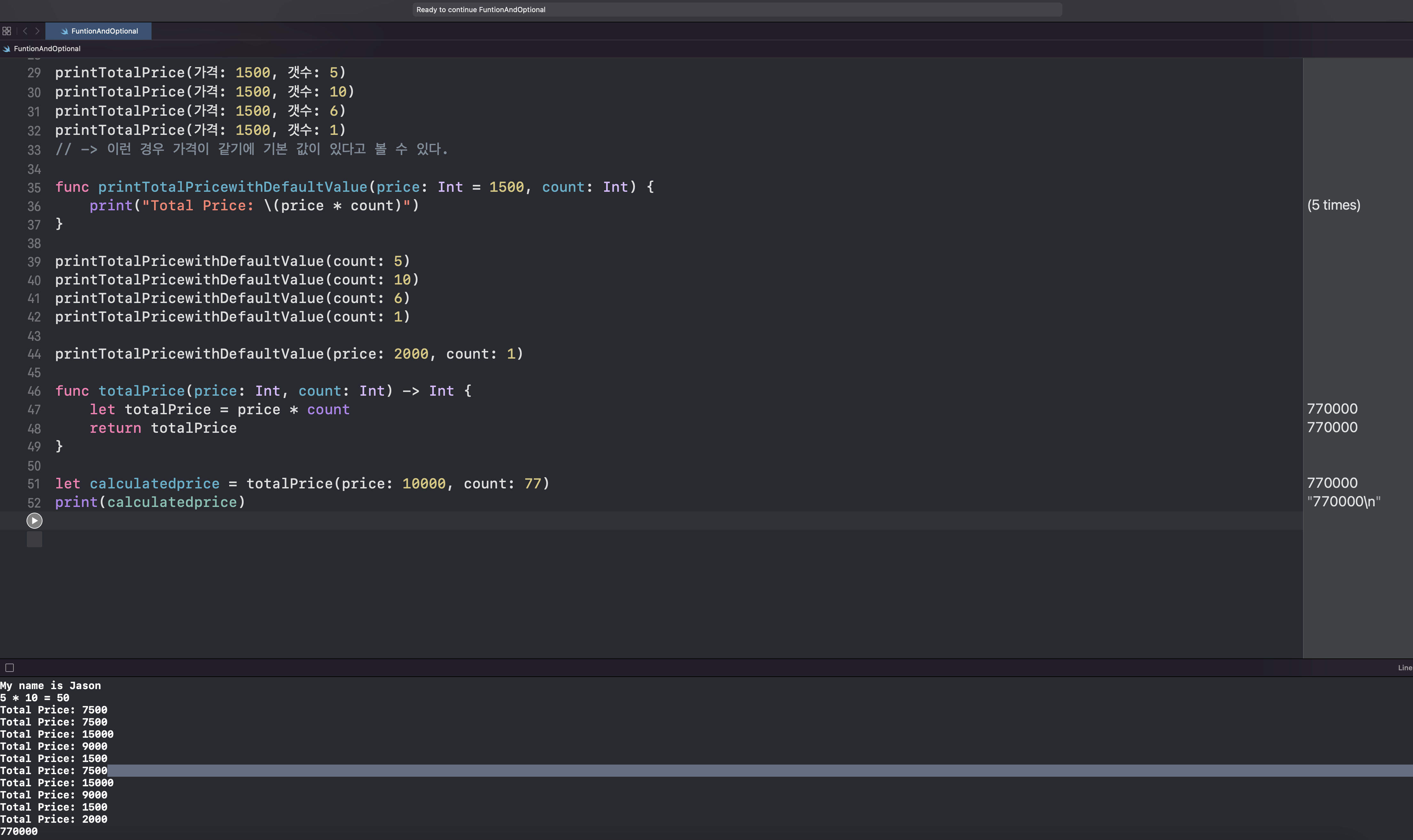 let calculatedprice = totalPrice(price: 10000, count: 77)