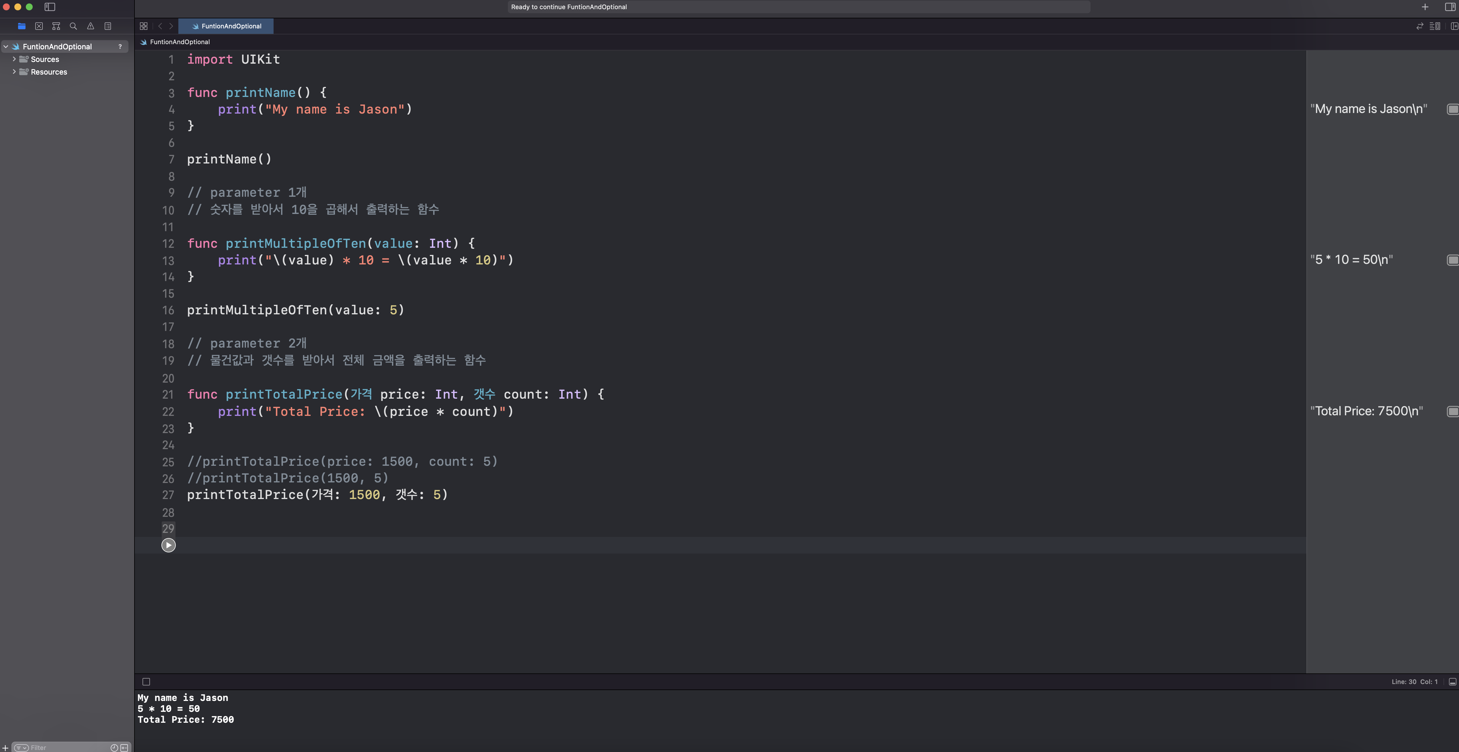앞에 func 키워드를 입력하고 함수의 이름을 넣어서 코드를 작성한다. 사용할 때는 함수의 이름으로 사용하면 된다.