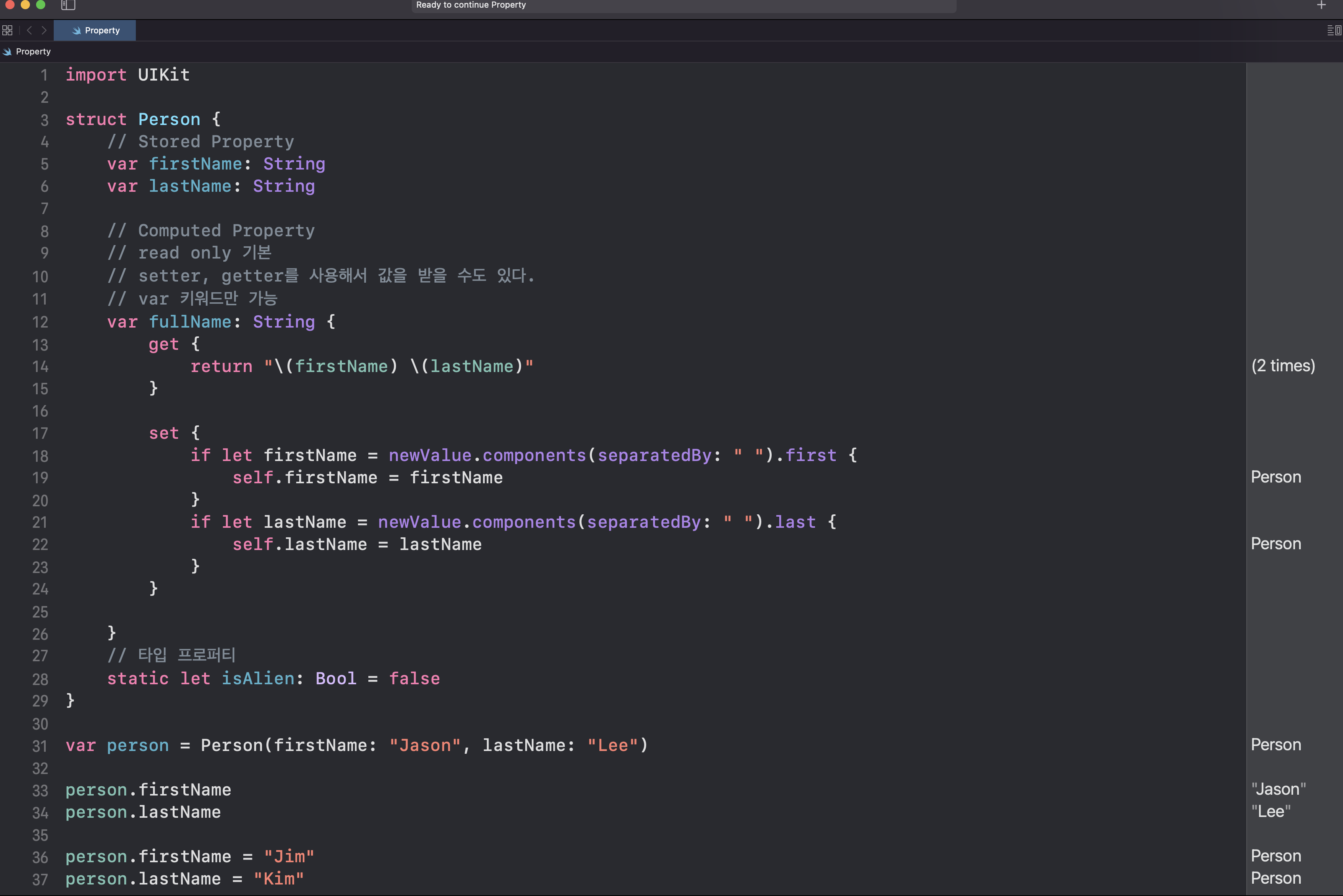 - Stored Property: 저장된 프로퍼티. 어떤 값을 변수로 가진 프로퍼티(인스턴스 프로퍼티)