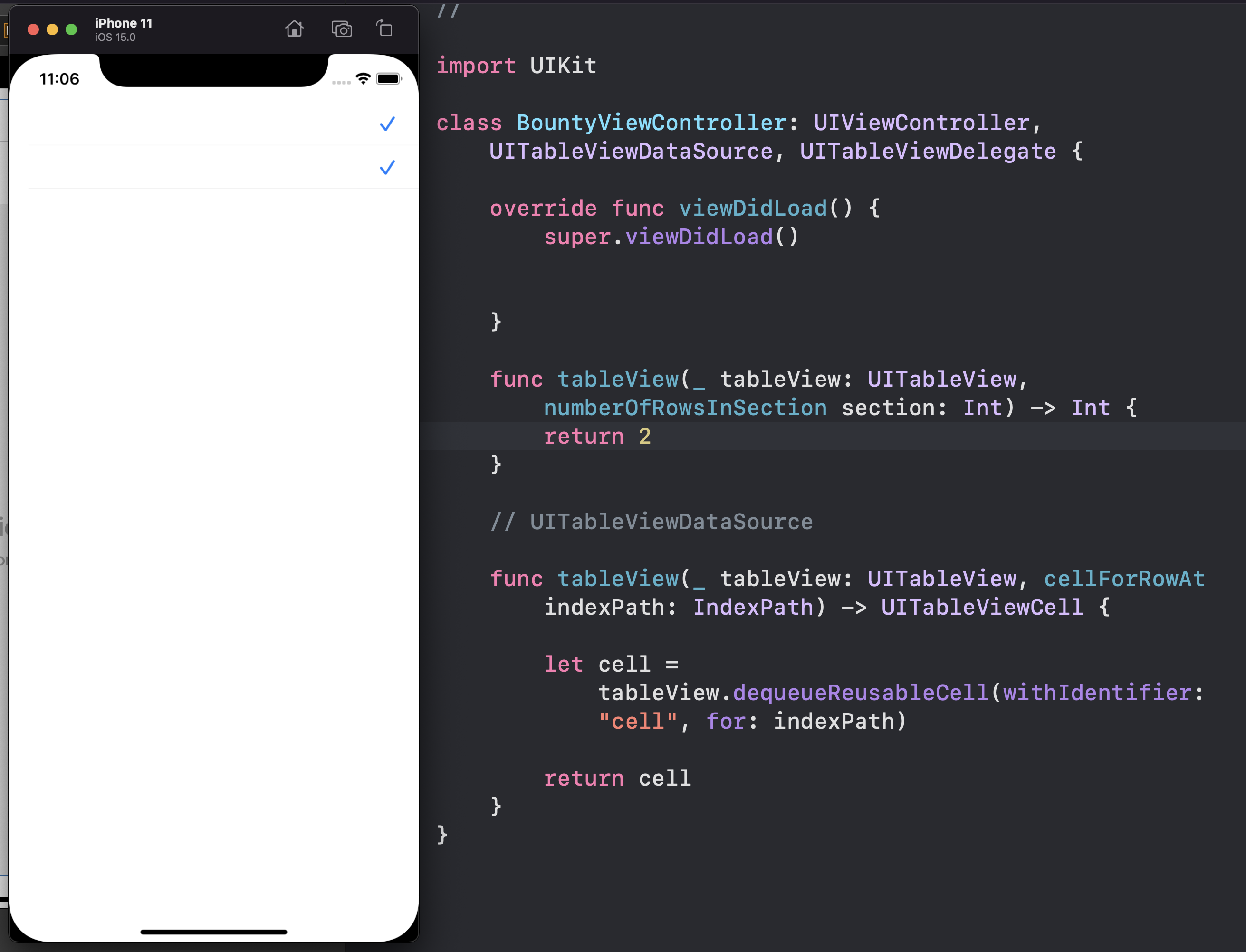 물론 이 외에도 다양한 것들을 물어보지만, 필수로 작성해야하는 것은 위의 2가지 질문입니다. 그리고 이 질문은 UITableViewDatasource에서 있습니다.